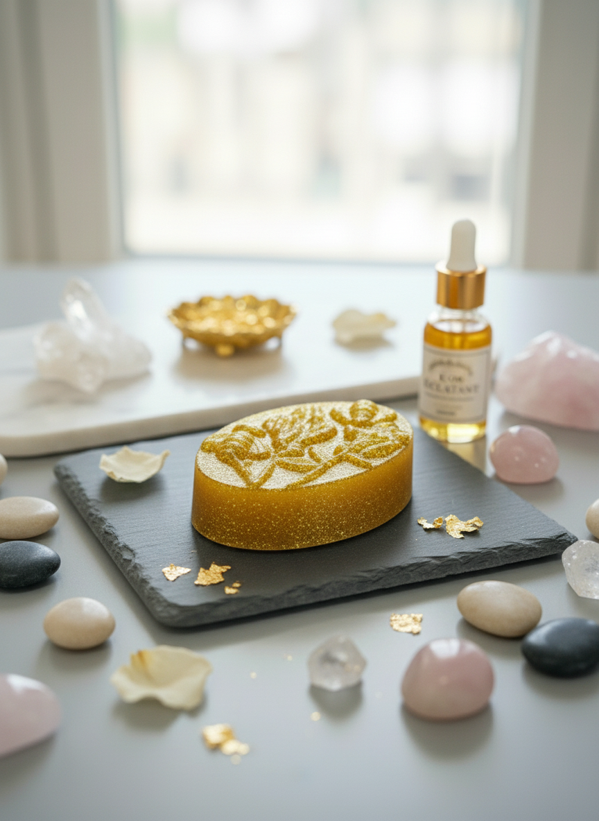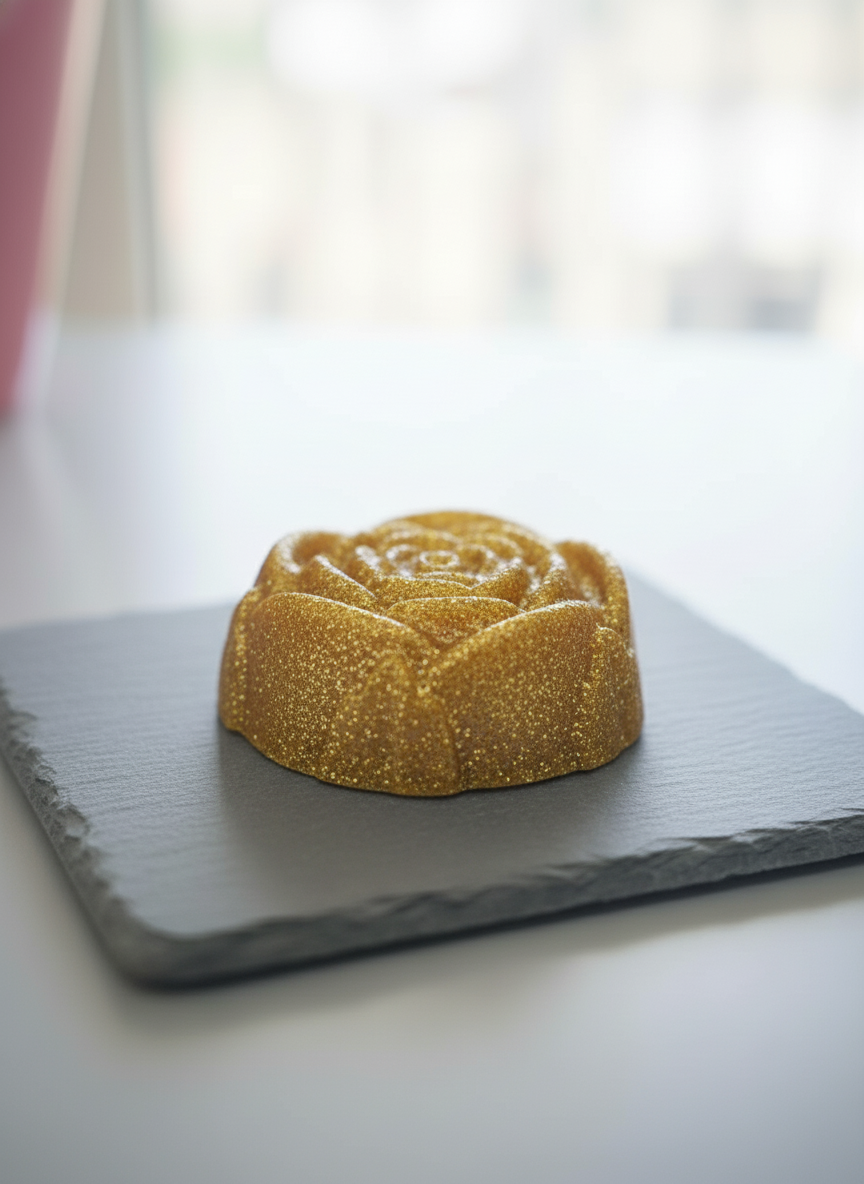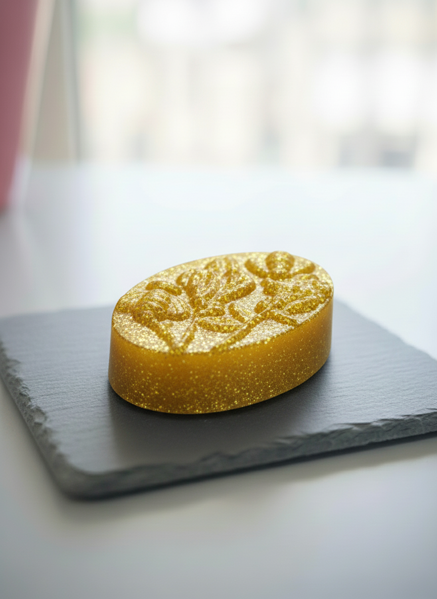 A luxurious handcrafted soap made with pure goat milk and infused with natural oils, rose essence, and a touch of shimmering glitter.
